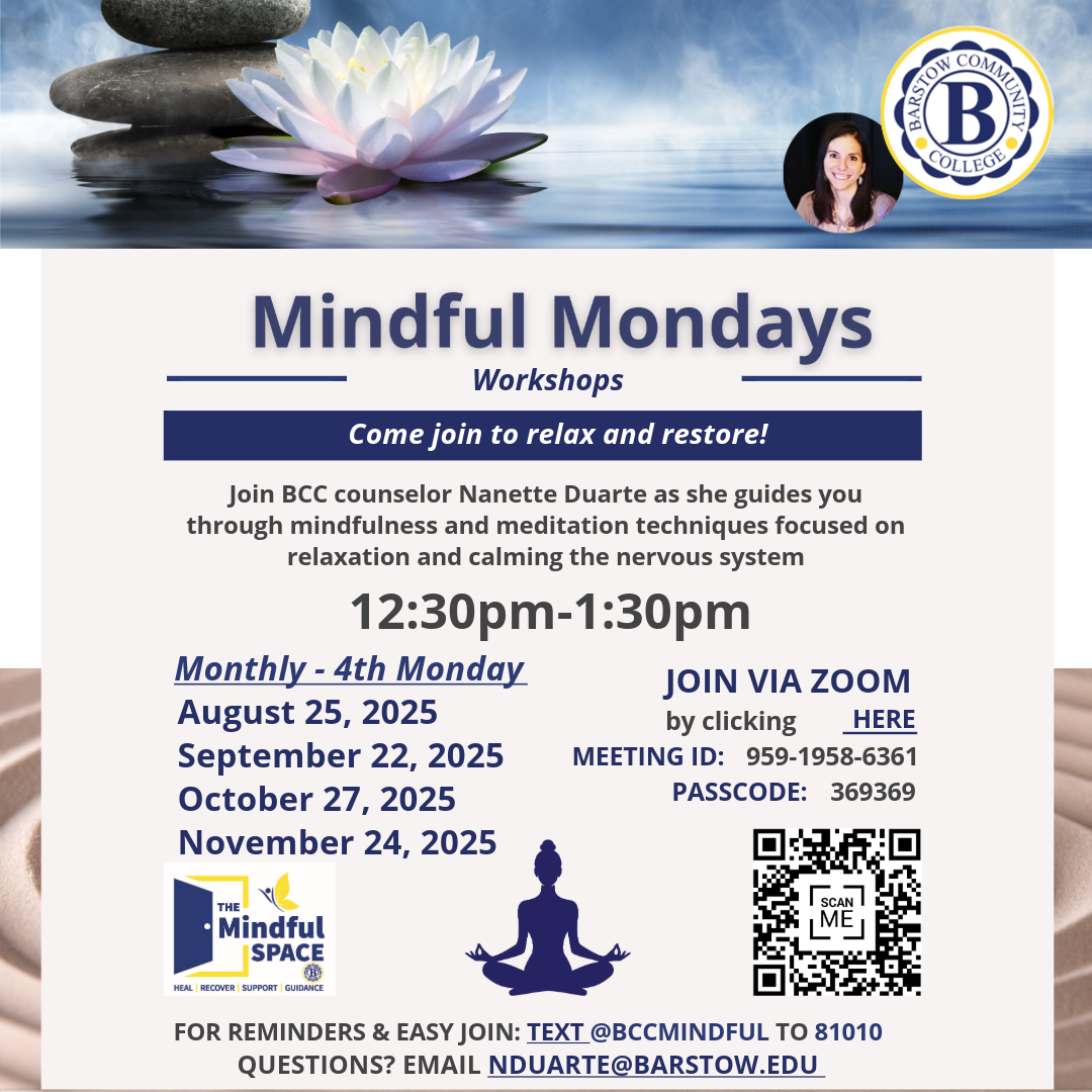 WELCOME to The Mindful Space at Barstow Community College. This is a place where students can receive mental health and wellness services from a licensed mental health counselor. Services are tailored to meet the needs of each individual and are provided free to students.