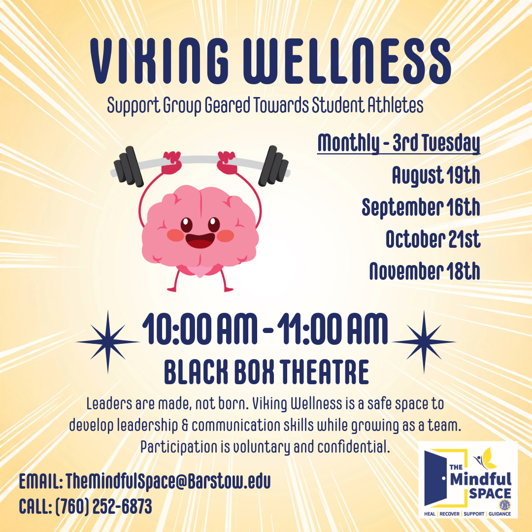 Make an Appointment: You can make an appointment or request a referral for virtual therapy by emailing themindfulspace@barstow.edu or calling (760) 252-6873.